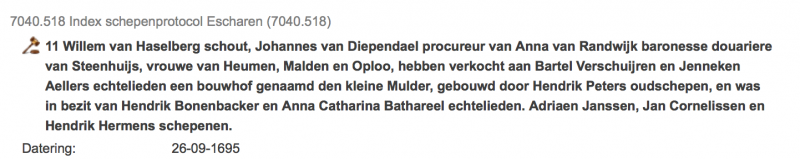 Hoe oud bouwhof De Kleine Mulder is, is niet precies te zeggen. In de index schepenprotocol van het Land van Cuijk hebben we verschillende koopaktes kunnen achterhalen. De oudste tot nu toe is bovenstaande akte uit 1695. Hieruit kunnen we afleiden dat De Kleine Mulder ooit gebouwd is door Hendrik Peters, die toentertijd schepen van Escharen was. Deze Hendrik verkoopt de boerderij aan Hendrik Bonenbacker.