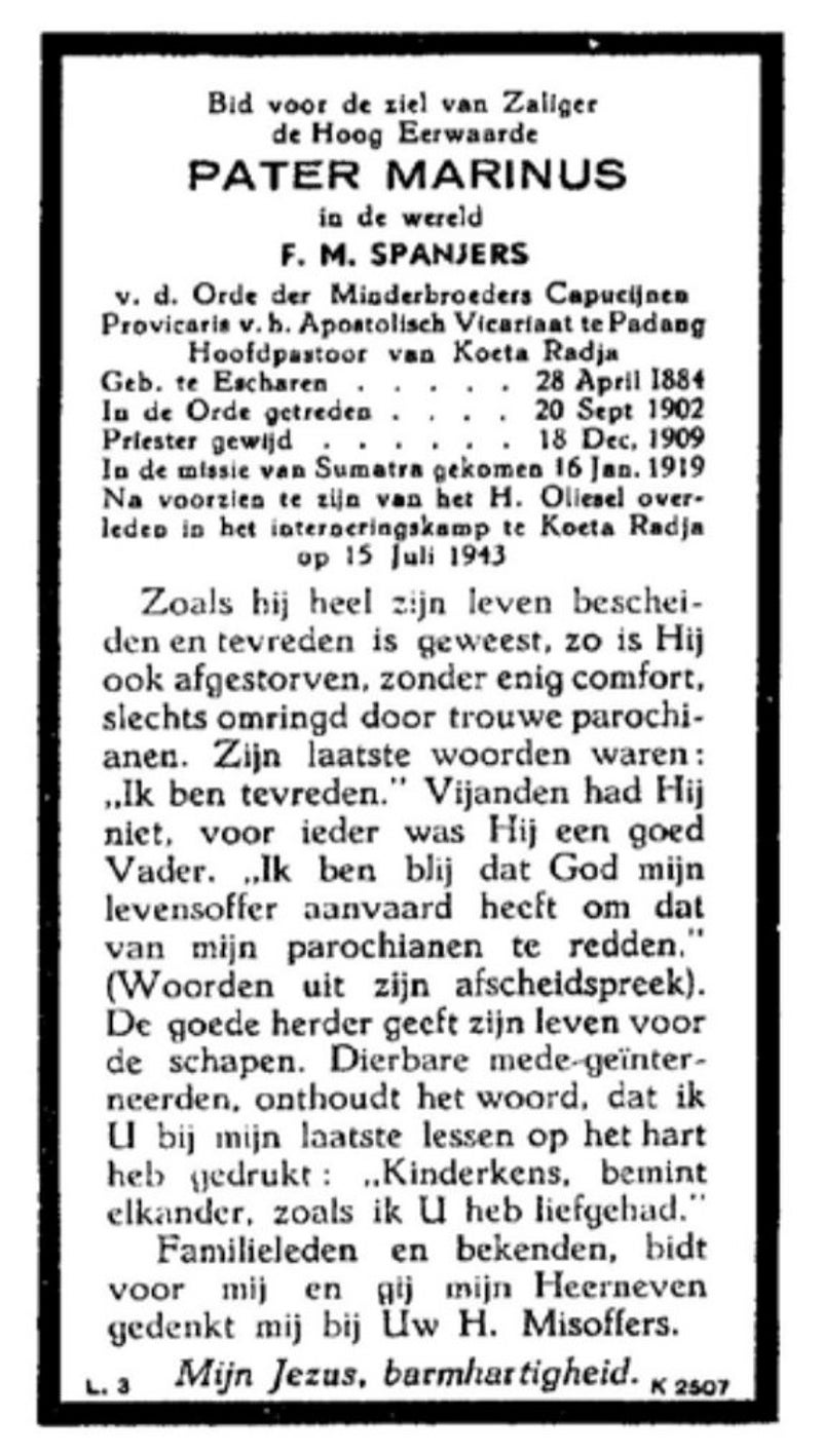 Over de omstandigheden waarop Pater Marinus overleed kunnen we iets lezen in een brief aan de familie Spanjers van een medegedetineerde in het kamp van Kota Radja, de heer Mr. P. de Leeuw, destijds hoofd van het plaatselijk bestuur: