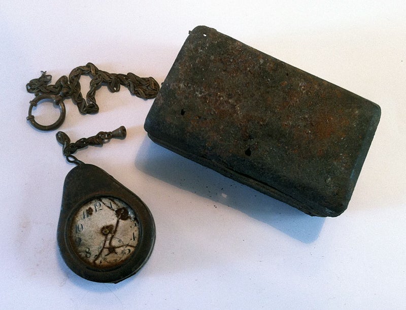 De wijzers van het horloge zijn gesmolten en lieten een afdruk na op de wijzerplaat: iets over half twee brak het inferno los. Deze zwaar gehavende kleinnoden worden binnen de familie van Karel Schel als tastbare herinneringen aan hun grootvader, nog steeds zorgvuldig bewaard.