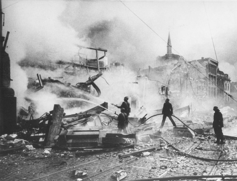 Op 22 februari 1944 werd Nijmegen gebombardeerd. Brandweermannen zijn bezig met het blussen van de restanten van het gebouw van de Vroom & Dreesman op de Grote Markt. Op de V&D viel een van de eerste bommen tijdens het bombardement op Nijmegen. In verschillende getroffen gebouwen in de stad brak daarna brand uit, zo ook bij de V&D.