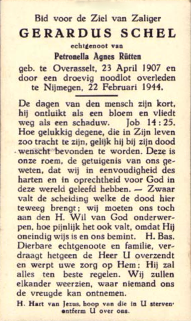 Grad (Gerard) Schel, zoon van Hendrikus Schel en Elisabeth Vissers, woonde met zijn zwangere echtgenote, Petronella Agnes Rutten, en negen kinderen aan de Middelweg 1, op de Bolt.