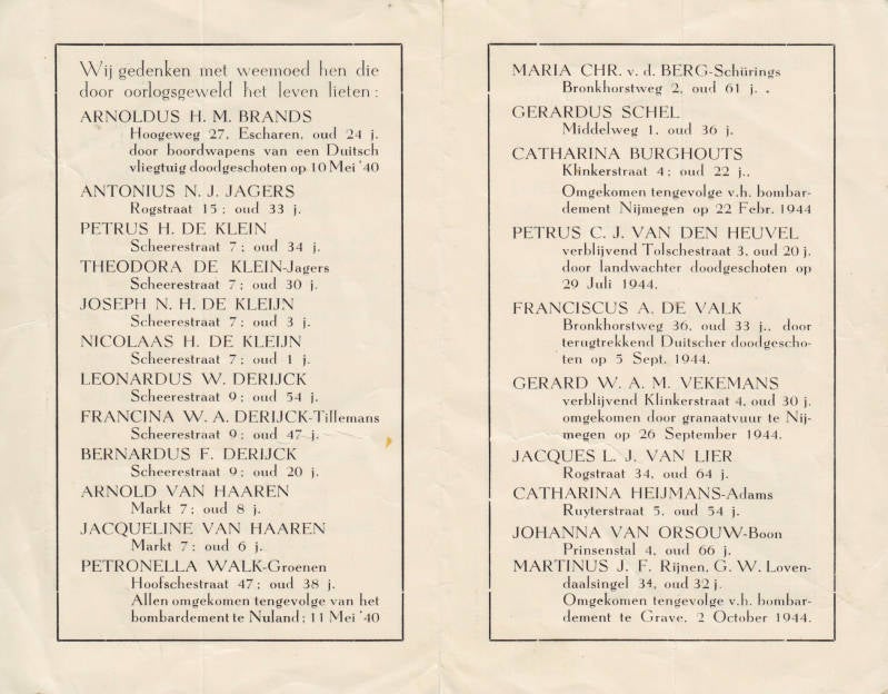 De Tweede Wereldoorlog heeft onder de inwoners van Escharen, 4 dodelijke slachtoffers gemaakt. Hieronder leest u wie zij waren en hoe zij om het leven kwamen.