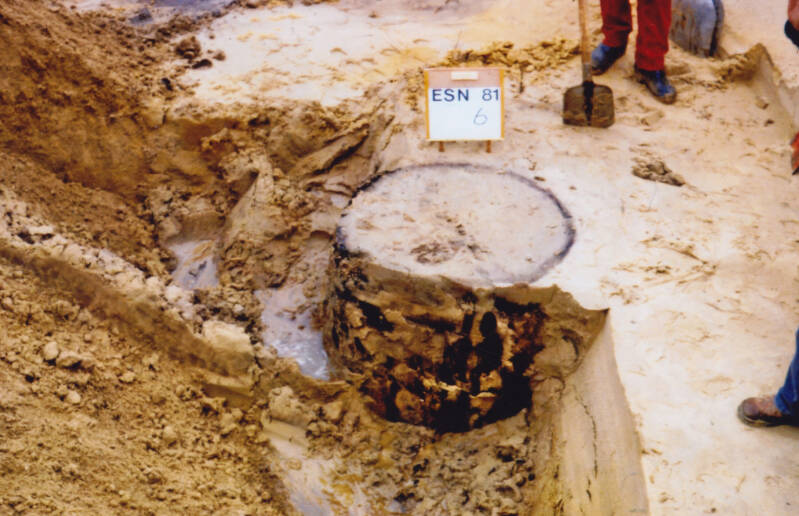 Na het verder uitgraven van een spoor komt de echte waterput tevoorschijn, een uitgeholde boomstam.