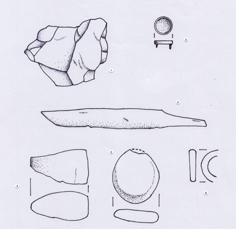 Tekening van enkele vroeg Middeleeuwse vondsten: 1: één van de vele gevonden ijzerslakken. 2: ijzeren mes. 3: fibula of sierspeldje van brons. 4 en 5: slijpstenen. 6: fragment van een glazen ring of hanger.
