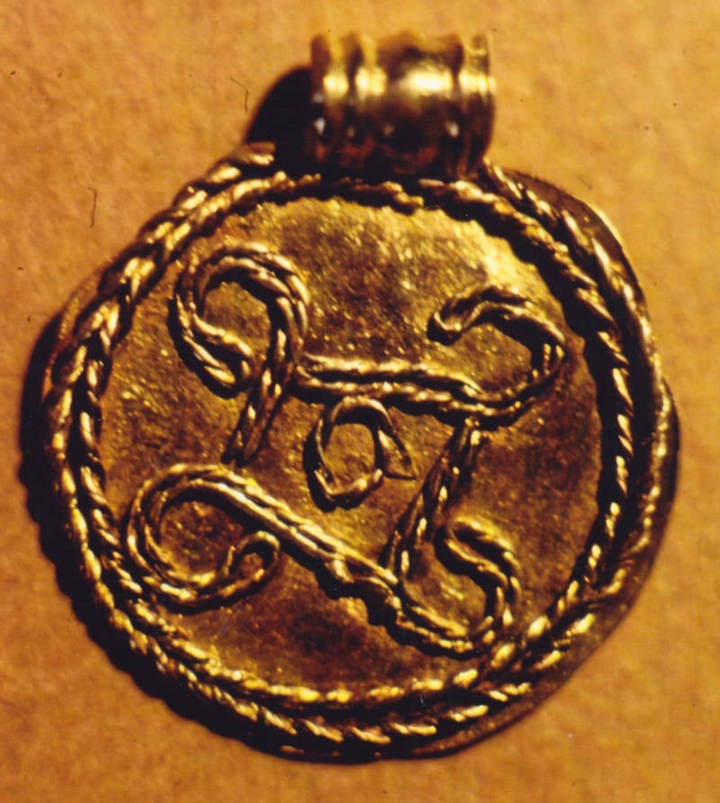 Boven: de gouden hanger uit de kist van de vrouwelijke grafkamer.