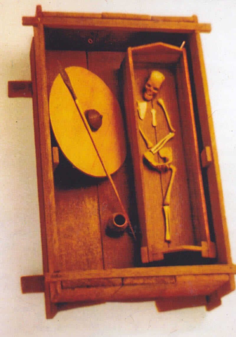 Zijn houten grafkamer heeft zich voordien bevonden onder een grafheuvel die omgeven was door een ingegraven greppel. Naast zijn houten kist in de houten grafkamer was een ruimte. Hierin bevonden zich nog de toenmalige bijgiften: een aardewerk pot, een (schild)knop, een zwaard, een lanspunt, een dolk en een bronzen riemgesp. Door de aanwezigheid van deze bijgiften werd het duidelijk dat de overledene een krijger moet zijn geweest.