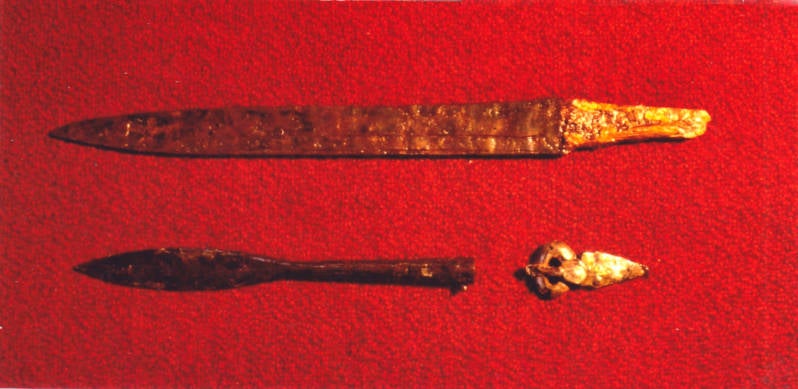 Op bovenstaande foto een brok 'roest' gevonden in de grafkamer. Op onderstaande foto de voorwerpen na reiniging en conservering. Een zwaard, een lanspunt en een bronzen riemgesp.