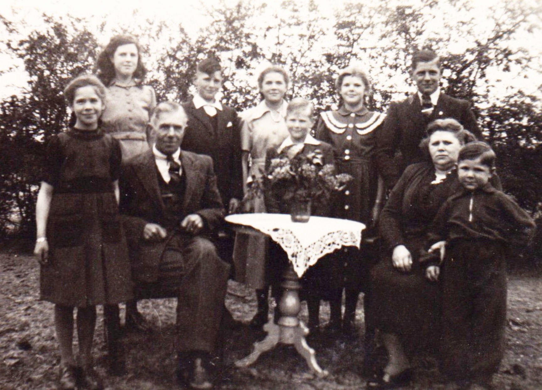 Frans Arts met zijn vrouw Regina Arts-Thoonen v.l.n.r. de kinderen: Regien, Jo, Richard, Geertje, Jan, Mies, Tien en Piet.