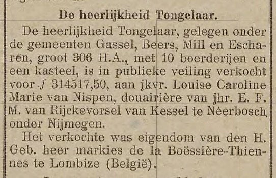 Uiteindelijk verkoopt Gaetan Markies de la Boëssiere op 12 juli 1917 Landgoed Tongelaar aan jonkvrouw Louisa van Nispen. Zij was nog geen jaar eigenares want op 6 juli 1918 verkoopt zij Tongelaar aan de gebroeders van Wagenberg te Vlijmen. (zie geschiedenis Tongelaar)
