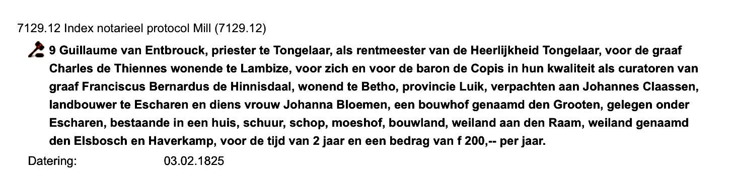 In het 'Cohier der Vaste Goederen' uit het jaar 1805, vind we de Grooten Hoff, onder nummer 67 terug. Eigenaar: de Heer van Tongelaar.