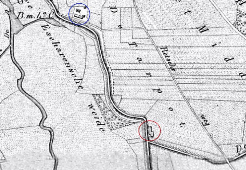 Uitsnede kaartje 1855. Met in de rode cirkel Den Tarpot en in de blauwe cirkel Hoog Escharen.