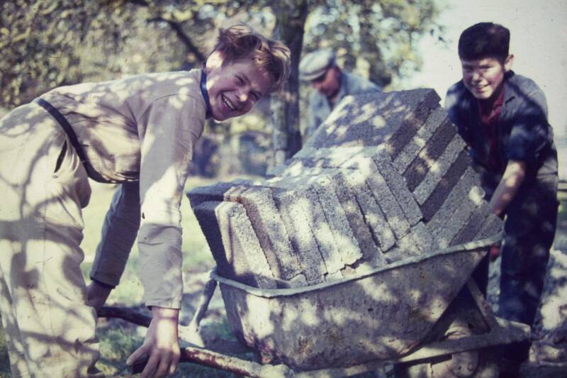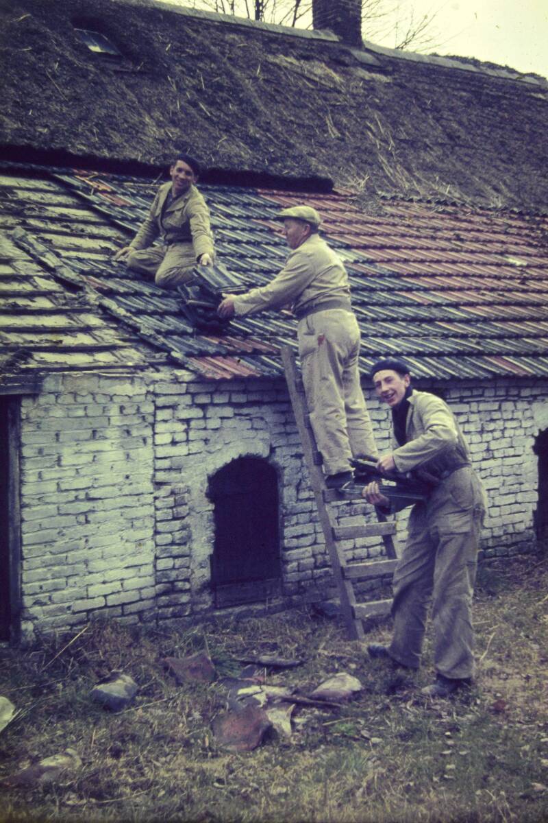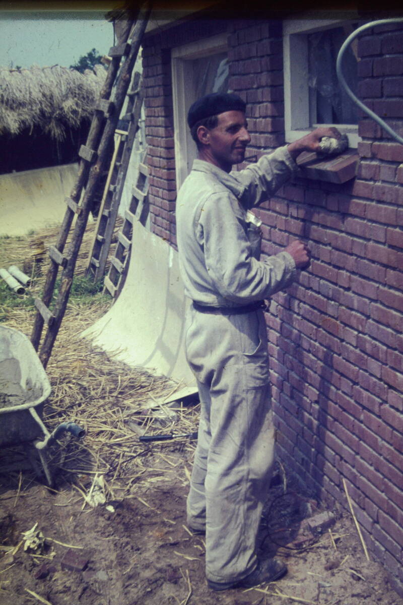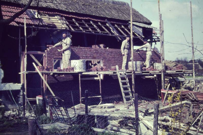 Hierboven is aannemer Cor Thijssen met zijn personeel aan het werk. Marius van Uije Pieterse had fotografie als hobby zodoende zijn hier mooie foto's van gemaakt. Han van Breughel die deze jaren lang in zijn bezit had heeft deze onlangs aan de huidige bewoners gegeven.