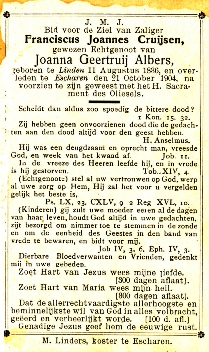 Hem mogen we zien als stamvader van de families Cruijsen die nu in 2016 nog in Escharen wonen.