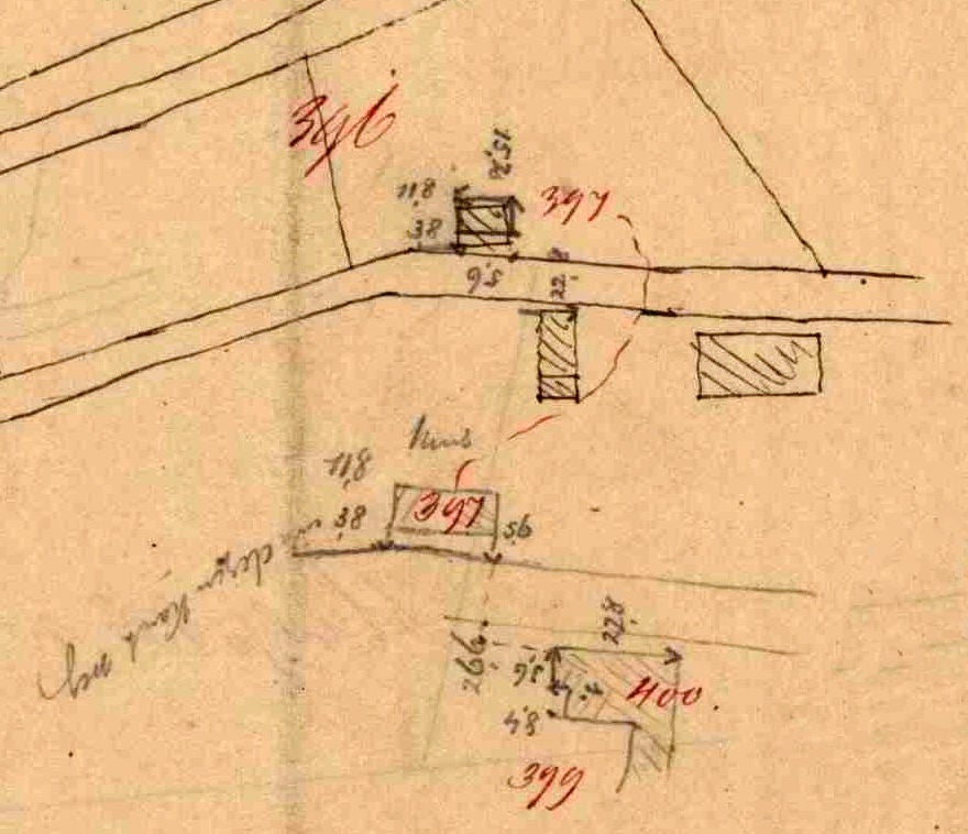 Hierboven een kadasterkaart uit 1870. De boerderij van Van Erp heeft door de brand dermate schade opgelopen dat er een gedeeltelijke herbouw plaats vindt. Het schoolgebouw is totaal verwoest en hier wordt, een aantal meters verder richting de Zandvoort, een nieuwe woning gebouwd. Deze doet echter niet langer dienst als ' Bijschool'. Lees hierover meer op de pagina; School op Hal.