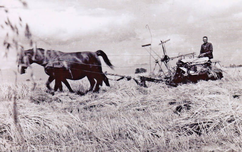 Piet Cuppen op het land aan het werk met toen de eerste combine van Escharen.
