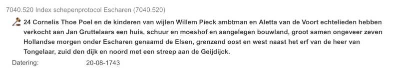 In de verkoopakte staat: 'Een huis, schuur, bakoven en moeshof met ongeveer zeven morgen bouw- en groesland, vanouds genaamd De Elsen, grenzend oost en west het erf van de Graaf van Tongelaar