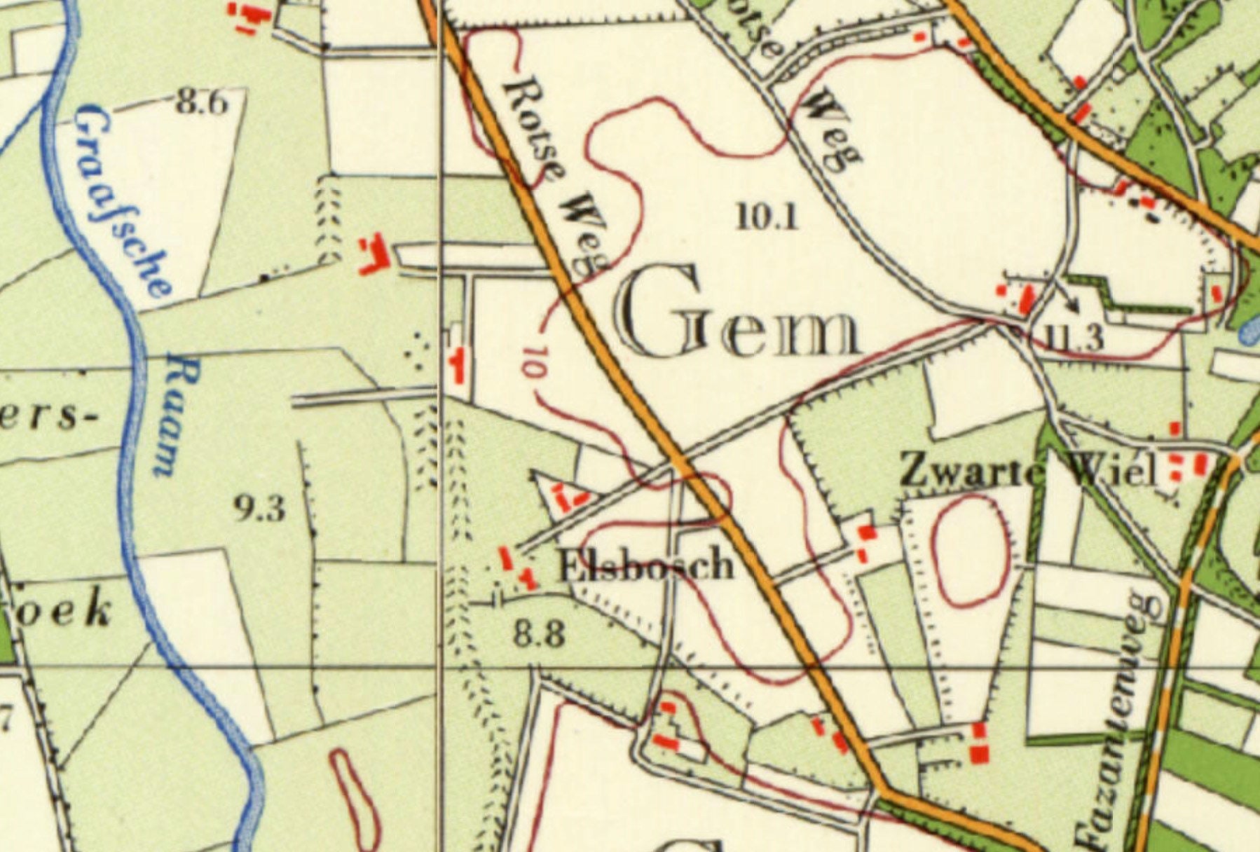 Op deze kaart staan ook nog de restanten van de oude dijk tussen de Raam en den Elsbosch aangegeven. Ook de Patrijzenweg, de straat die vanaf de Elsbosch liep over de Geijsdijk naar de Middelrotscheweg liep, staat hier nog op de kaart.