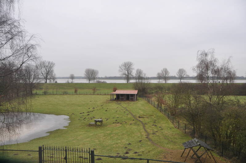 Aangezien de woning hoog op dijk staat is het zicht vanuit de oude woonkamer nog steeds prachtig. Zo ligt de wiel nog onveranderd in het weiland.