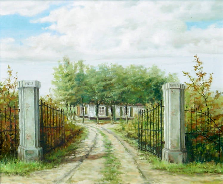 Verlovingsfoto van dochter Johanna Martens (1896-1992) met Wilhelmus van der Coer uit Zeeland. Ze zijn in 1924 getrouwd. Deze foto is gemaakt tussen de toegangspoort van Villa Nova. Deze zuilen stonden aan het begin van de oprijlaan, dus aan de Jan van Cuijkdijk. Over de rechterschouder van Willem zien we in de verte achter de bomen Villa Nova liggen. Het schilderij boven aan deze pagina geeft de locatie van de zuilen dus niet naar waarheid weer. Artistieke vrijheid dus van de schilder, deze wilde waarschijnlijk én de boerderij én de toegangspoort op zijn schilderij hebben.