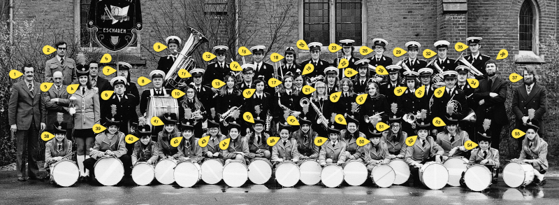 De personen 19 t/m 34 waren niet alleen bestuursleden. De meeste waren lid van de Commissie van Aanbeveling. Zij kwamen verspreid over het dorp (iedere buurt 1) om de fanfare in de beginjaren, vooral ook financieel, te ondersteunen en te promoten.