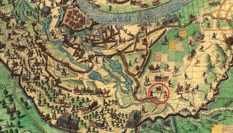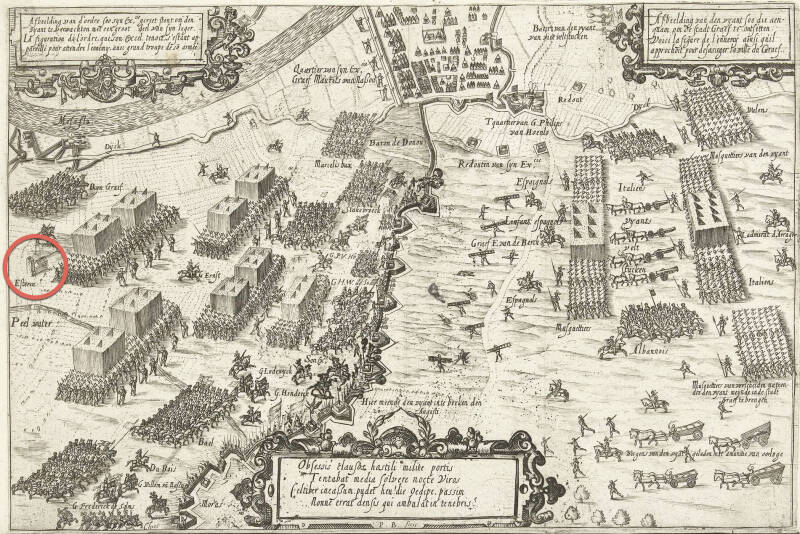 Mislukte poging door aartshertog Albrecht om in 1602 Grave te ontzetten. Afbeelding van de aankomst van het Spaanse leger bij de verdedigingslinie van het Staatse leger. In de rode cirkel te midden van de circumvallatielinie, het dorp 'Esteren', Escharen.