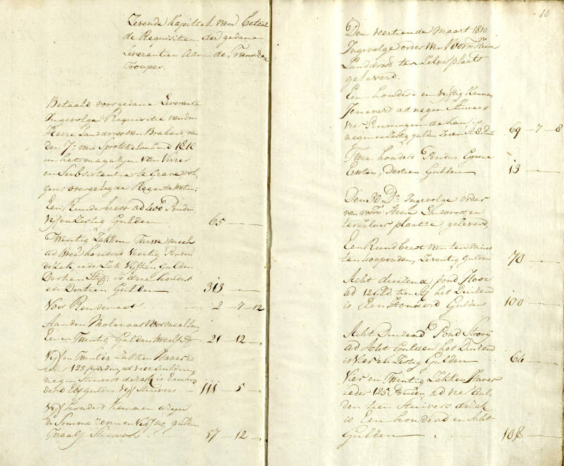 'Betaald voor gedane Leverantie ingevolge gedane Requisitie van den Heere Landdrost van Braband van den 7e van sprokkelmaand 1810 in het magazijn van Vines en Subsistentie* te Grave volgens overgelegde reçu te weten: een Runderbeest ad 400 ponden... etc.'