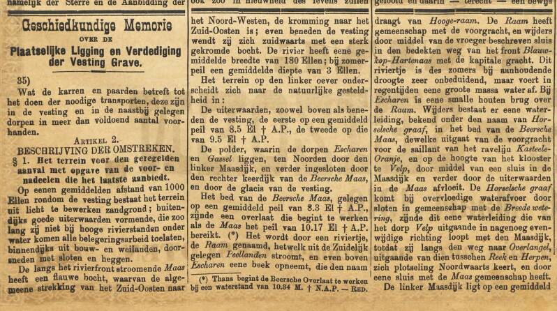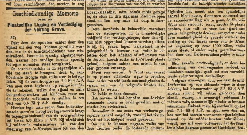 In 1910 verscheen in de Graafsche Courant de artikelenreeks: ‘Geschiedkundige Memorie over de Plaatselijke Ligging en Verdediging der Vesting Grave’. In 1850 hebben Majoor Engelberts en twee luitenants een verslag gemaakt over de situatie van Grave en omstreken tijdens het beleg van Grave in 1815.