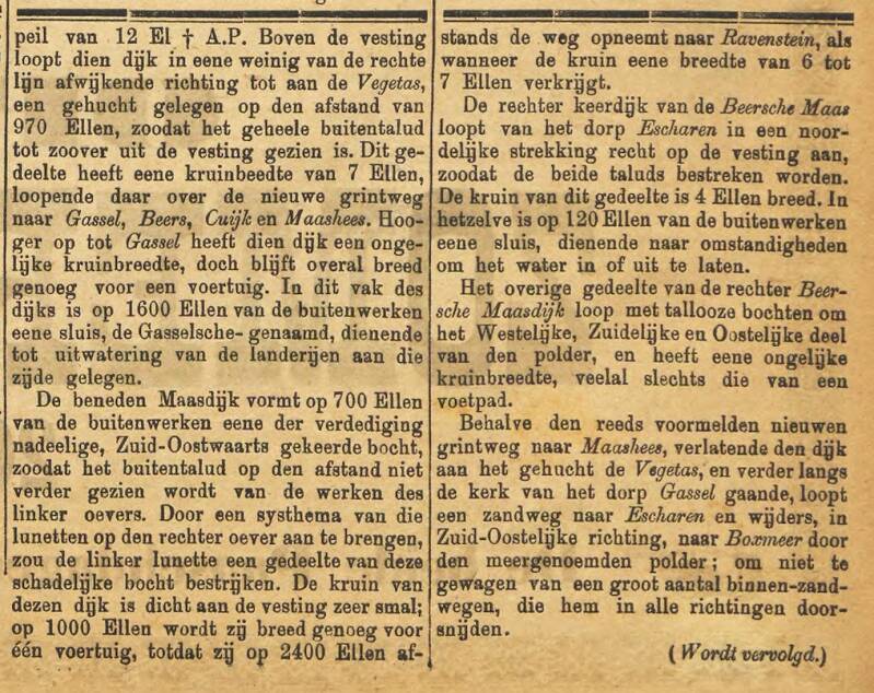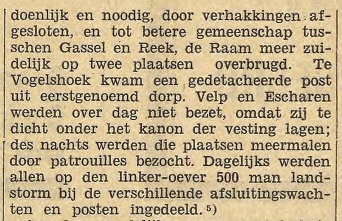 ‘ Behalve het dorp Reek werd ter bewaking van het hoge terrein tussen de Maas en de overstroomde landen langs de Raam, het dorp Gassel bezet. De tussengelegen wegen werden afgesloten.’