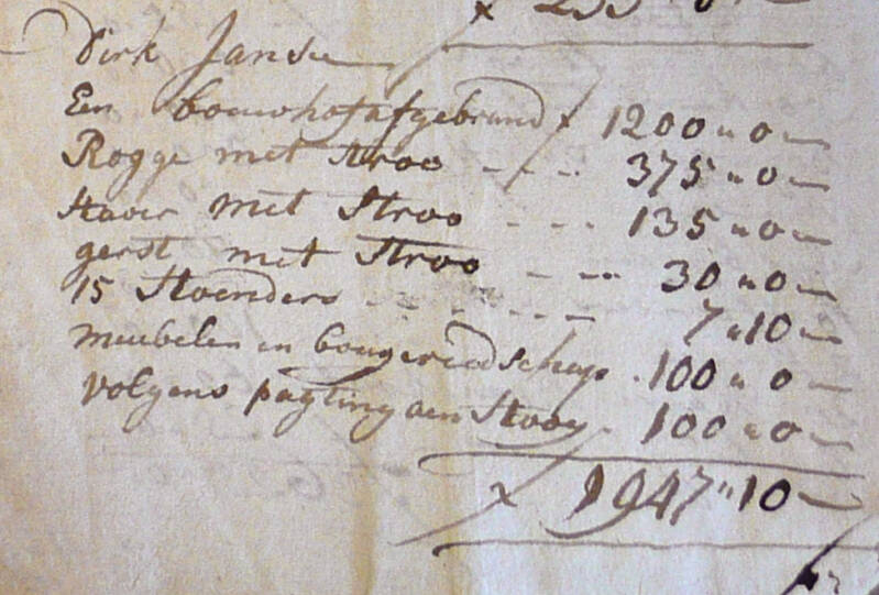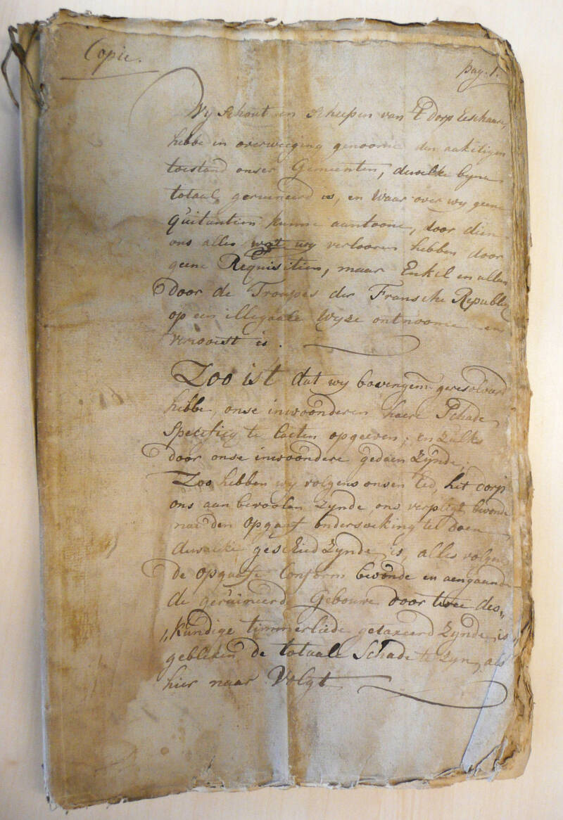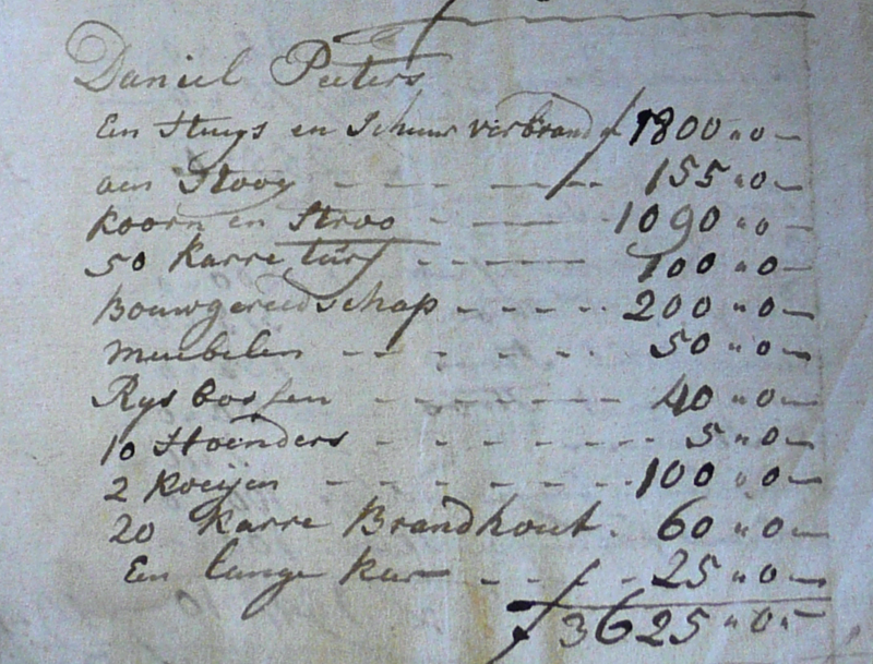 ‘Dese voorgemelde schade hebbe onse gemeente in de uijtersten armoede gedompelt, en zelfs zoo dat de meeste onser inwoonderen ten lasten hunner familien dewelke in andere dorpen woonen, aldaer voor haare arme beroofde vrouwe, kinderen, en day weijnige vee, dat haer nog is overgebleven moete onderhoud zoeken, en dit alles, is alleen nog niet genoeg om te zeggen, wij zijn totael geruineerd: maar het besaaijen onser landrijen dat nu niet meer kan zijn, brengt ons niet alleen voor dit jaer, maar nog voor een reeks van jaeren buiten 't genot van die inkomste, welke onze inwoondere geheel en al niet missen kunnen.’
