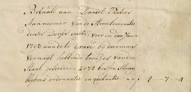 In het archief van het BHIC, in de map Dorpsbestuur Escharen 1793, zit een rekening voor levering van 2078 bossen strooi aan 'de troepen van den Staat' in vesting Grave. Elk dorp in de omgeving had een verplichte hoeveelheid strooi te leveren. Hier in Escharen verzorgde Danïel Peeters 'Aannemer van de Strooij leverantie deeses Dorps quota' in het jaar 1793 daarvoor.