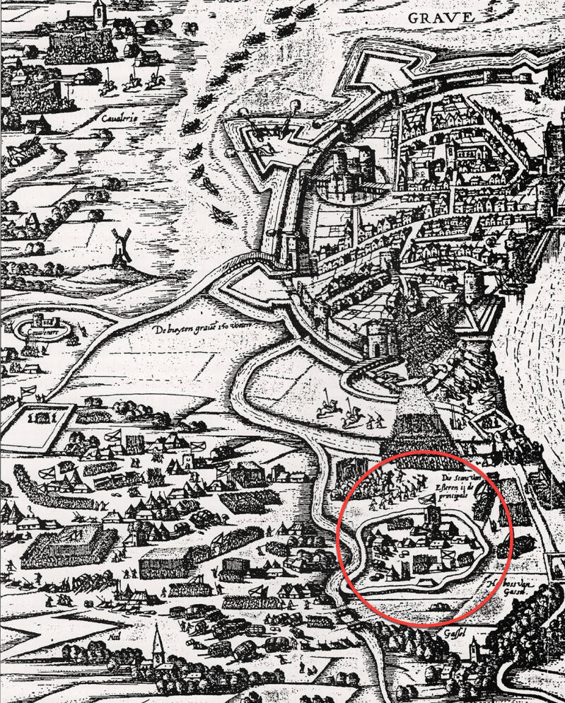 Op 18 juli 1602 begon de omsingeling van de stad Grave. De soldaten van Prins Maurits groeven zich in. Ze wilden de Spaanse bezetter via uithongering tot overgave dwingen. In de stad zaten ruim duizend soldaten. Na een beleg van 2 maanden gaven de Spanjaarden zich over. Zo kwam de stad in het Nederlandse kamp terecht.