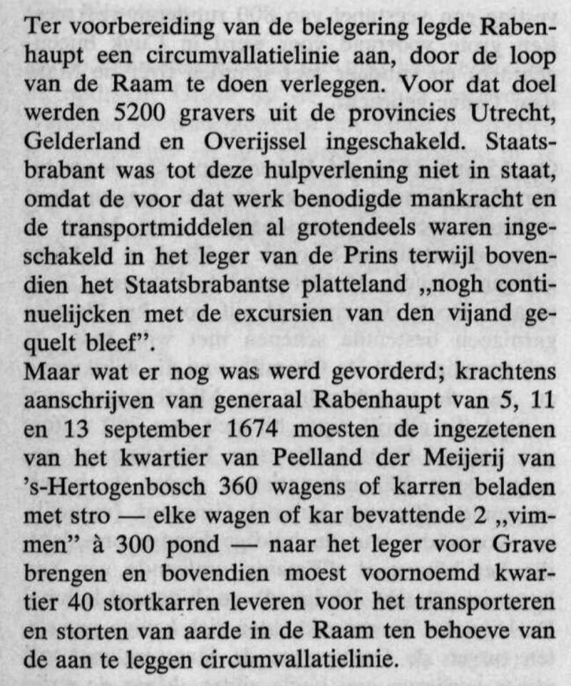 De Franse opperbevelhebber De Chamilly ging de vestingwerken rondom Grave versterken. Hiervoor werden boeren uit de wijde omgeving met kar en paard gedwongen om aan deze graafwerkzaamheden te werken. Ook moest er voldoende voedsel binnen de stadsmuren worden gebracht. Ook dit vlees en veevoer moesten de dorpsbesturen leveren.