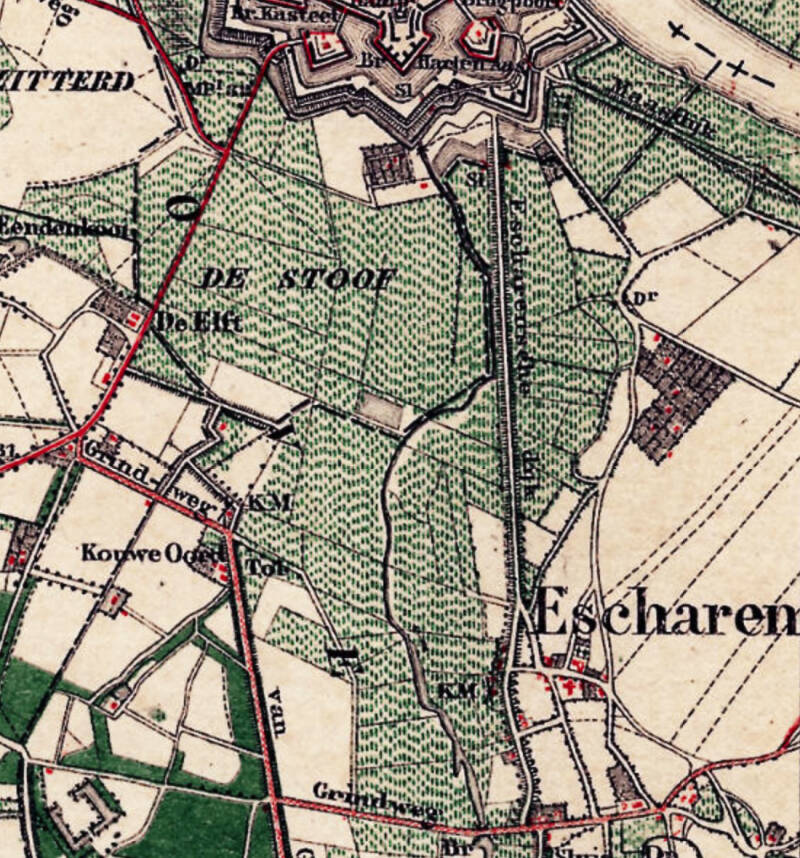 Tussen de vesting en de circumvallatielinie, wallen en schansen in ligt in de rode cirkel 'Esteren'.