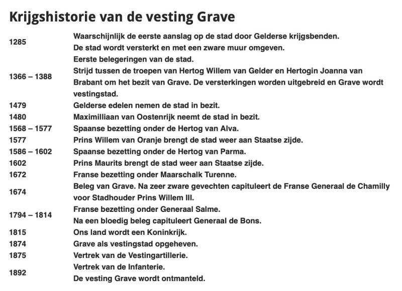 Hieronder een overzicht van de krijgshistorie van vesting Grave afkomstig van de website Bommeltje.nl.