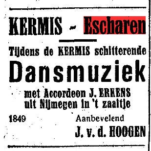 Het Zaaltje werd ook gebruikt als feestlocatie bij dorpsfeesten. In deze advertentie uit de Gelderlander van 1934 maakt Jan van den Hoogen reclame om Kermis te komen vieren.