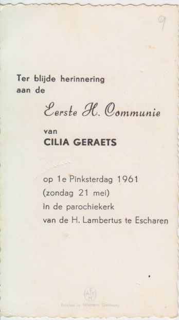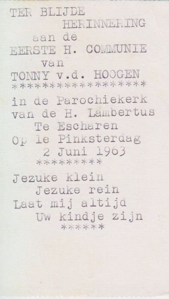 Heel lang deed men hier in Escharen, op 1e Pinksterdag de Eerste Heilige Communie.