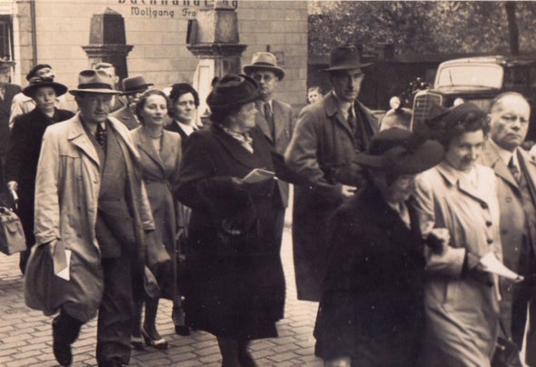 Frans en Regina Arts lopen mee in de Maria-processie te Kevelaer. Veel parochianen gingen hier jaarlijks op bedevaart. Ook de Mariaverering in Katwijk, Uden of Handel werden bezocht.