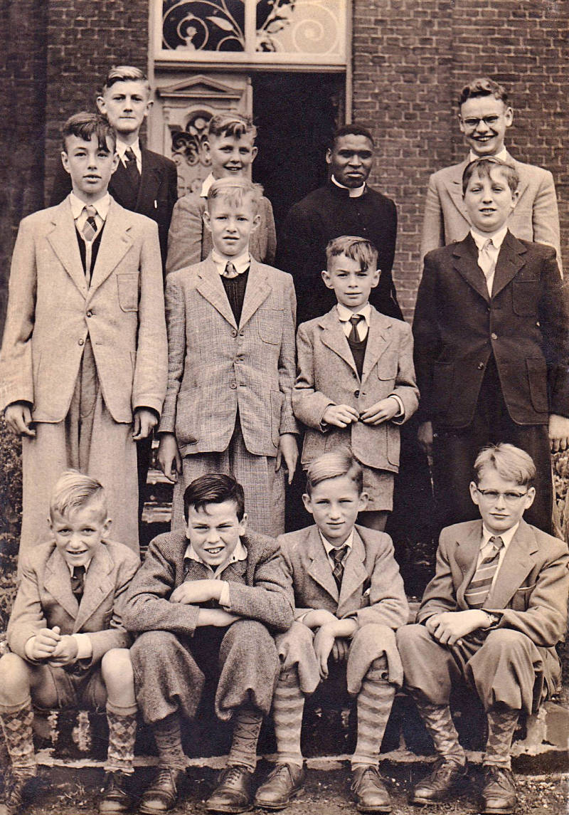 Op de bordestrap van de oude pastorie zitten de misdienaars en priesterstudenten. Het was de gewoonte om 1e Paasdag bij de pastoor eieren te gaan eten. Foto afkomstig van Arnold Cuppen.