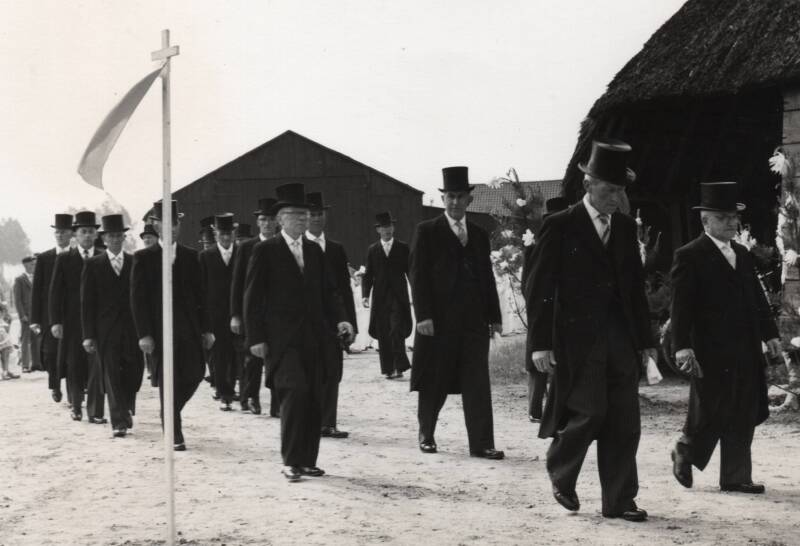 Priester Marius Schraven vertrok in defilé naar de kerk. Daarbij voorafgegaan door een stoet van mannen met een slipjas en hoge hoed. Onduidelijk is ons nog of dit het St. Antonius Abt Gilde of het Kerkkoor is. Waarschijnlijk het Gilde. Hierachter liep een stoet van schooljeugd. Jongens in een nette broek met een witte blouse en stropdas. Gevolgd door een grote hoeveelheid bruidjes. Ieder meisje had destijds immers een communie- of processiejurk. De laatste vier meisjes droegen een soort van baldakijn versierd met bloemen. Hieronder liep Marius Schraven. Achter hem liepen familieleden en verdere genodigden. Vooraan de stoet liep het organisatiecomité, hoofdonderwijzer Frans Bongaards en Janus Kuijpers van het Kerkbestuur.