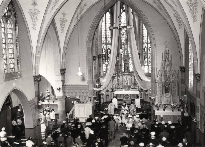 Deze fotoreportage laat ons mooi het oude kerkinterieur zien, met het prachtige oude hoofdaltaar en de communiebank. De Eucharistieviering was wat men noemde ‘een mis met drie heren’. Pastoor Stevens was daarnaast in een feestelijk kazuifel natuurlijk ook aanwezig. Alle misdienaars en akelieten hadden een taak.