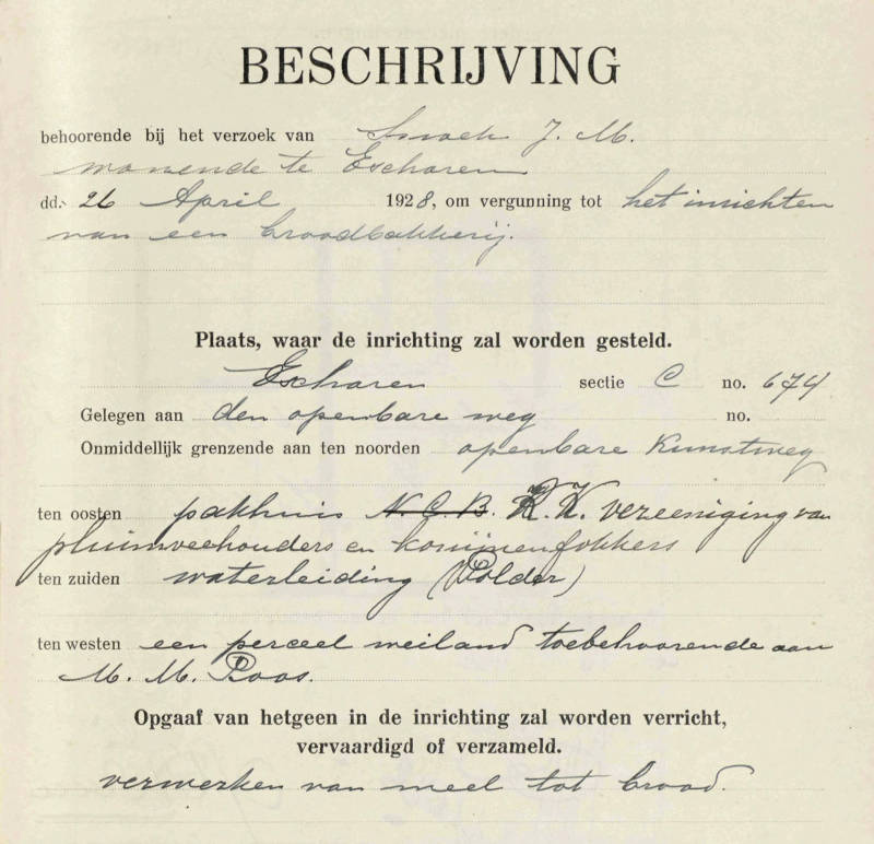 Aan de Beerschmaasweg wordt een perceel grond gekocht voor het bouwen van een woning met bakkerij. Jan wilde als zelfstandig bakker aan de slag.