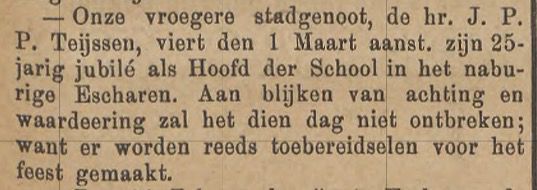 Johannes Petrus Paulus (Jan) Teijssen werd in 1836 in Grave geboren. Hij werd in 1864 hier in Escharen hoofd der school. Op 34-jarige leeftijd trouwde hij met de toen 29-jarige Escharense Henrica van Raay. Henrica was een dochter van Rut van Raay (meester timmerman en wonende op Den Alendonk) en Johanna Cuppen.