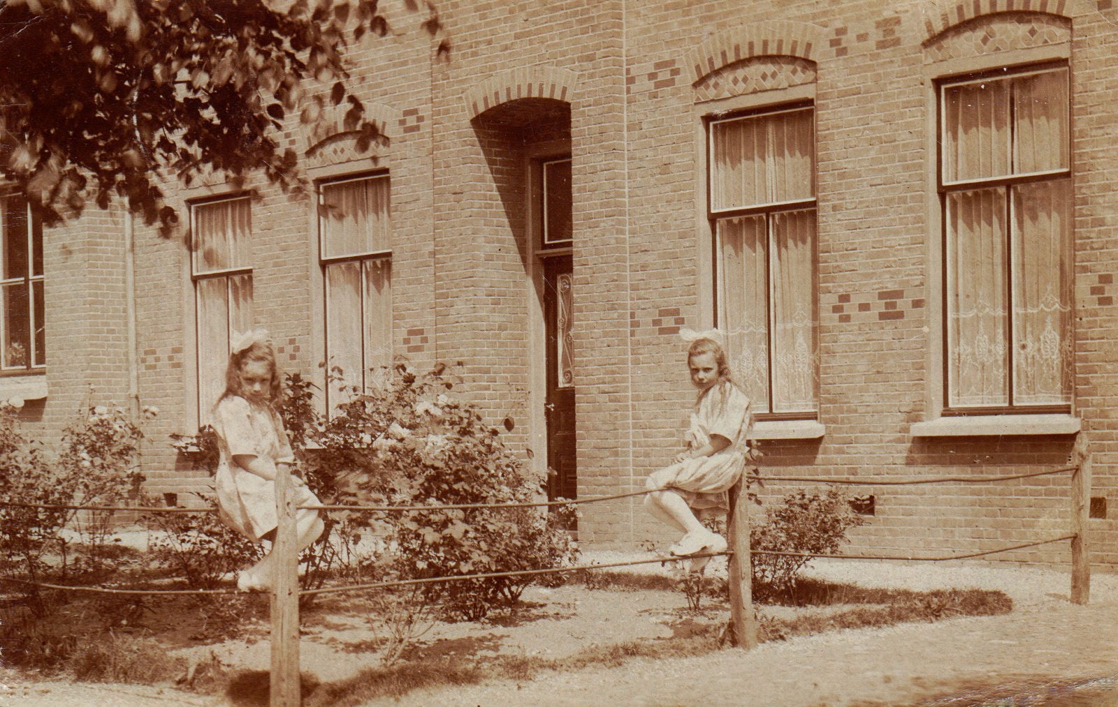 Piet en Marie krijgen twee dochters. In 1912 Bets (Lamberta Maria Johanna) en in 1915 Anny (Johanna Petronella Paulina Hermina). Hierboven een foto uit 1923 waarop Bets en Anny in de voortuin van het schoolhuis staan.
