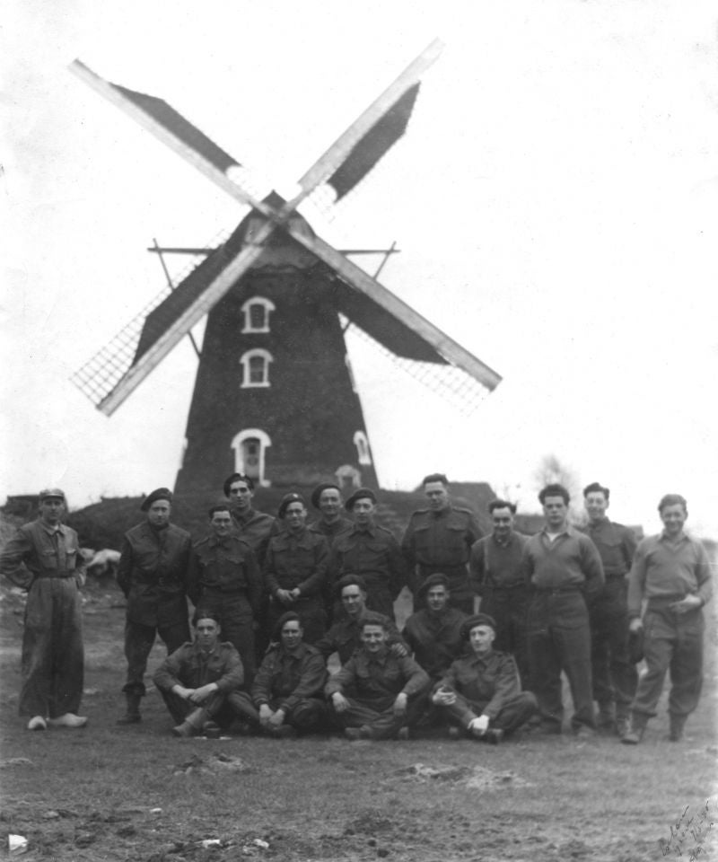 Molenaar Toon van Iersel met Canadese soldaten voor zijn molen aan de Zanddijk.