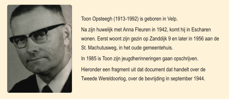 Op het tabblad 'Herinneringen aan Escharen', verteld Toon Opsteegh over de bevrijding, op 17 sept. 1944. Klik hier om zijn verhaal te lezen.