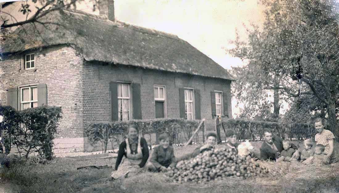 Zomer 1945: In de boomgaard voor de boerderij van Daan Cuppen aan de Schrijfakkerweg 12. Met op de foto v.l.n.r. Moeder en zoon N.N., evacuees uit Nijmegen, twee 'knechten' Bert Verbruggen en Jo Cuppen (van Ties), Daan Cuppen en Lies Cuppen-Daamen met kinderen; Theo, Dinie en Jo. Hun witte Keeshond is later door de Engelse militairen meegenomen.