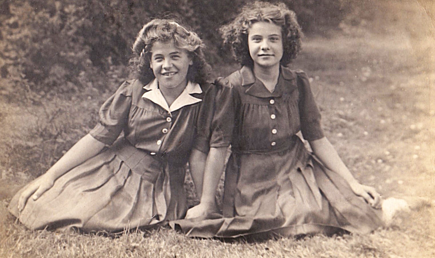 1945: Zus(Jo) en Nellie Koenen, Lageheiweg 3, in rode jurkjes gemaakt van parachutestof.