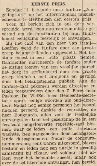 Op 29 juni 1922 wordt tijdens een muziekconcours te Wijchen, Fanfare Jongelingslust bekroond met de Eerste Prijs en de Ereprijs voor het hoogst aantal behaalde punten.