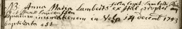 Anna Maria Lamberts geboren in Hall, wettige dochter van Lambertus Pau.. en Anna Laurenssen is vanwege het water op 14 december 1753 in Velp gedoopt.