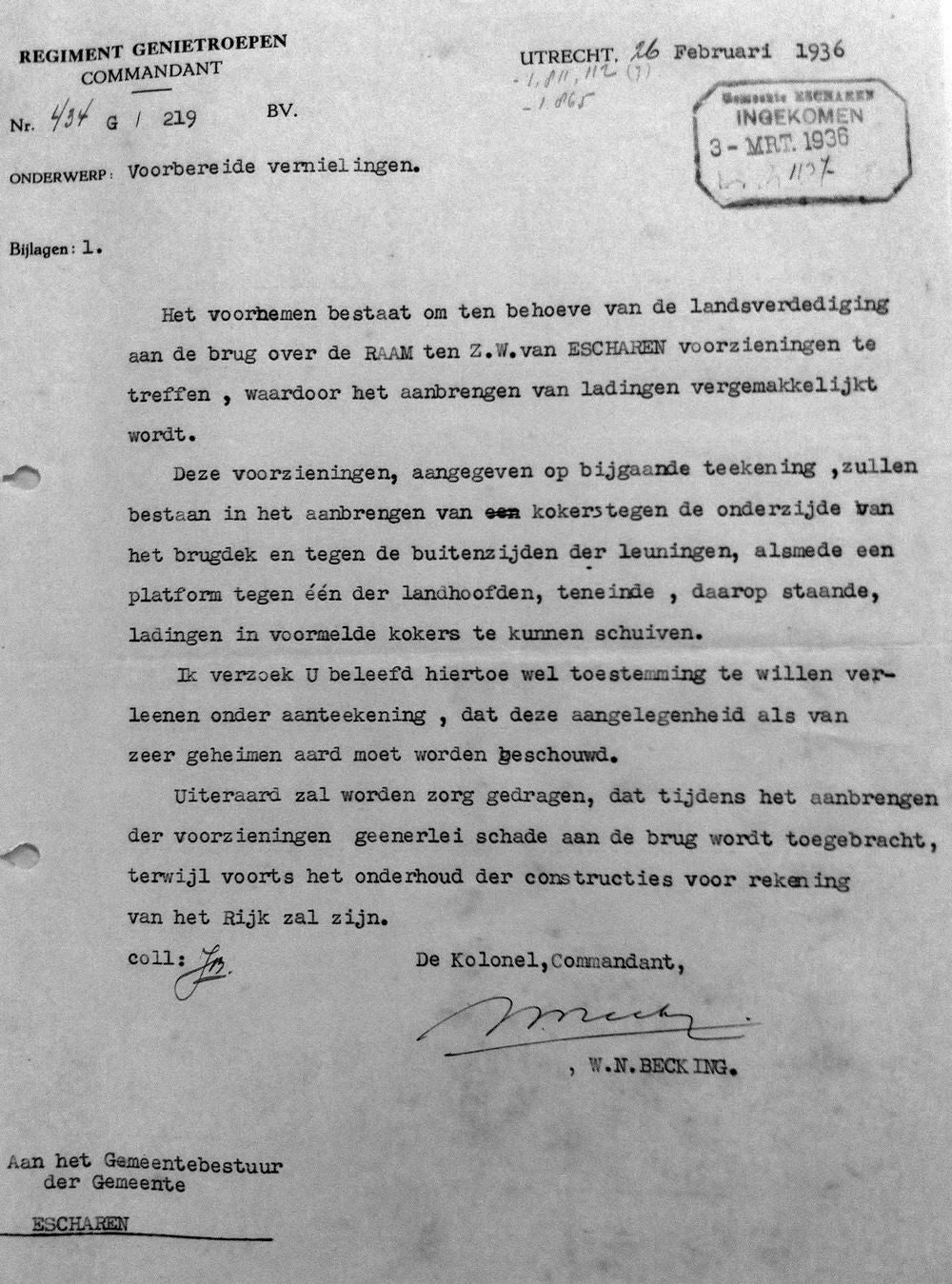 In de vroege ochtend van 10 mei 1940 werd de Raambrug opgeblazen om zodoende een mogelijke Duitse opmars via Escharen te vertragen of te stoppen. Helaas werd niet alleen de brug vernield maar ook de dam werd ernstig beschadigd met als gevolg dat het waterpeil langzaam zakte in het onder water gezette Raamdal. Ook de boerderij van Frans Spanjers, hoek Beerschemaasweg/Zanddijk, liep door de ontploffing schade op, brokstukken van de brug beschadigden het dak. Dit alles had geen invloed op het verloop van de strijd. Op enige schietincidenten na hebben de Duitsers niet geprobeerd de Peel-Raam stelling bij Escharen door te breken.